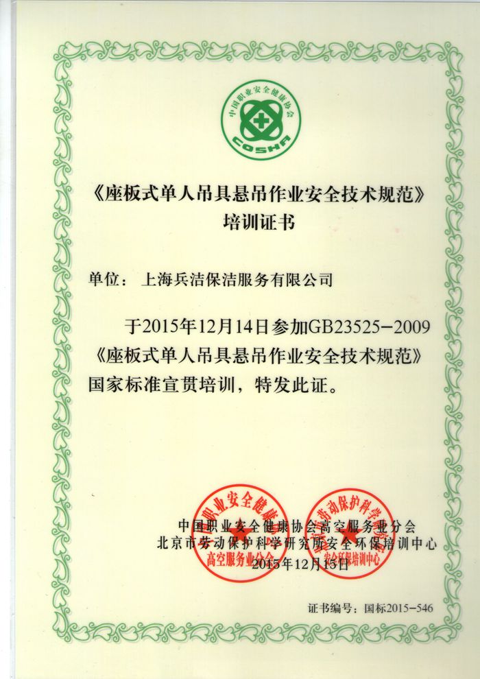 • 懸吊作業(yè)安全技術(shù)國家標(biāo)準(zhǔn)宣貫培訓(xùn)證書