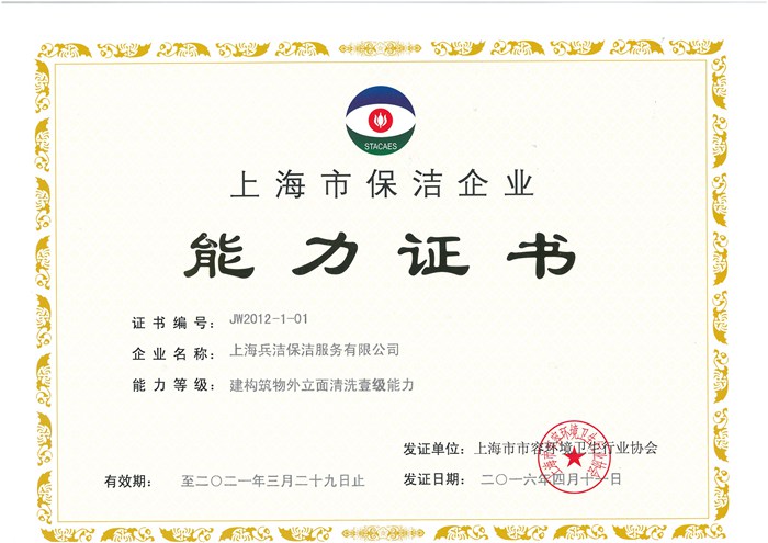 上海兵潔環(huán)境服務(wù)有限公司成立于2005年9月,專業(yè)從事外墻清洗、內(nèi)(外)墻粉刷、開荒清潔、石材翻新養(yǎng)護(hù)、外墻維修、地毯清洗,辦公樓、住宅樓、商場、工廠、賓館、醫(yī)院、展覽展示館等各類物業(yè)場所的日常保潔服務(wù)。公司現(xiàn)有員工1200余人,服務(wù)項目200多個,其中外墻清洗服務(wù)面積1500多萬平方米,日常保服務(wù)面積500多萬平方米。公司秉承“誠信務(wù)實、安全高效、吃苦耐勞、勤勉細(xì)致” 的企業(yè)作風(fēng)和“專業(yè)來自敬業(yè),服務(wù)創(chuàng)造品質(zhì)”的基本理念,全面導(dǎo)入ISO9001:2008質(zhì)量管理體系認(rèn)證證書,ISO14001:2004環(huán)境管理體系認(rèn)證證書,OHSAS18001:2007